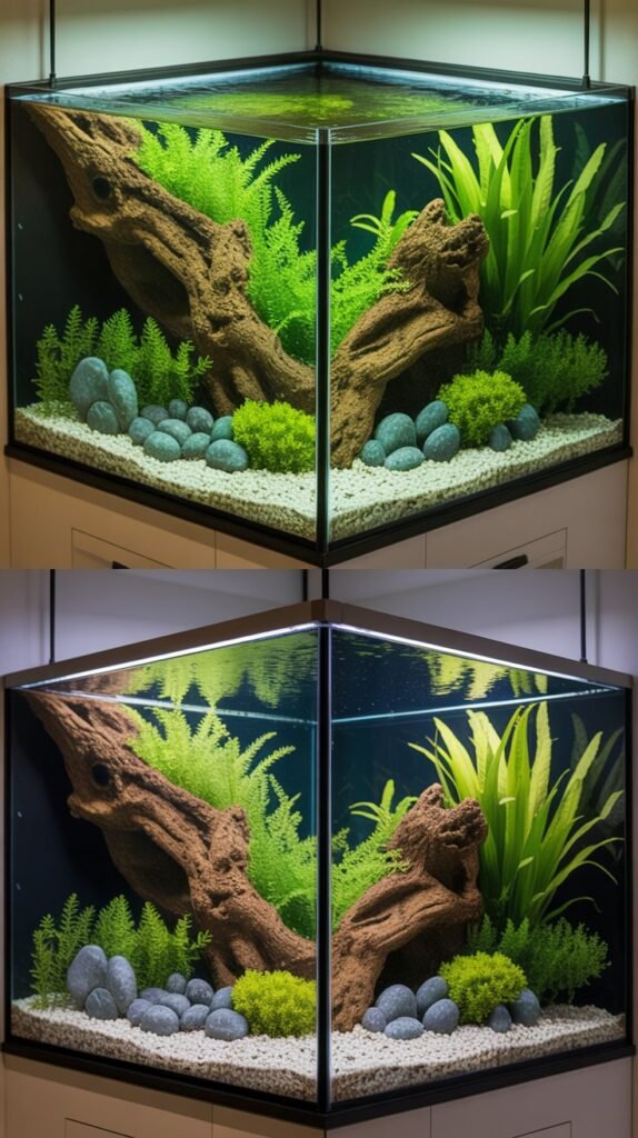 - Triangular tanks – Place larger rocks or driftwood at the back corner, sloping downward for depth.